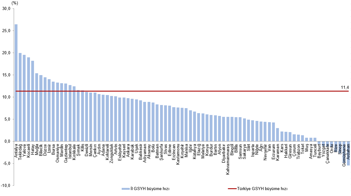 Yıllık GSYH'nin, zincirlenmiş hacim endeksiyle bir önceki yıla göre %11,4 artışına en fazla katkı veren il %3,96 ile İstanbul oldu. İstanbul'u %0,95 ile Ankara ve %0,85 ile İzmir izledi. Yıllık GSYH büyümesine 2021 yılında negatif yönlü katkı veren illerin başında %0,007 ile Ordu, %0,008 ile Rize, %0,009 ile Çanakkale yer aldı.